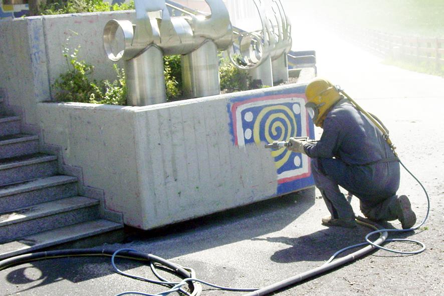 Verunreinigte oder gestrichene Oberflächen von Granit, Marmor, Beton, Natursteinfassade, usw. reinigen wir mit modernster Technik und ohne Chemie.